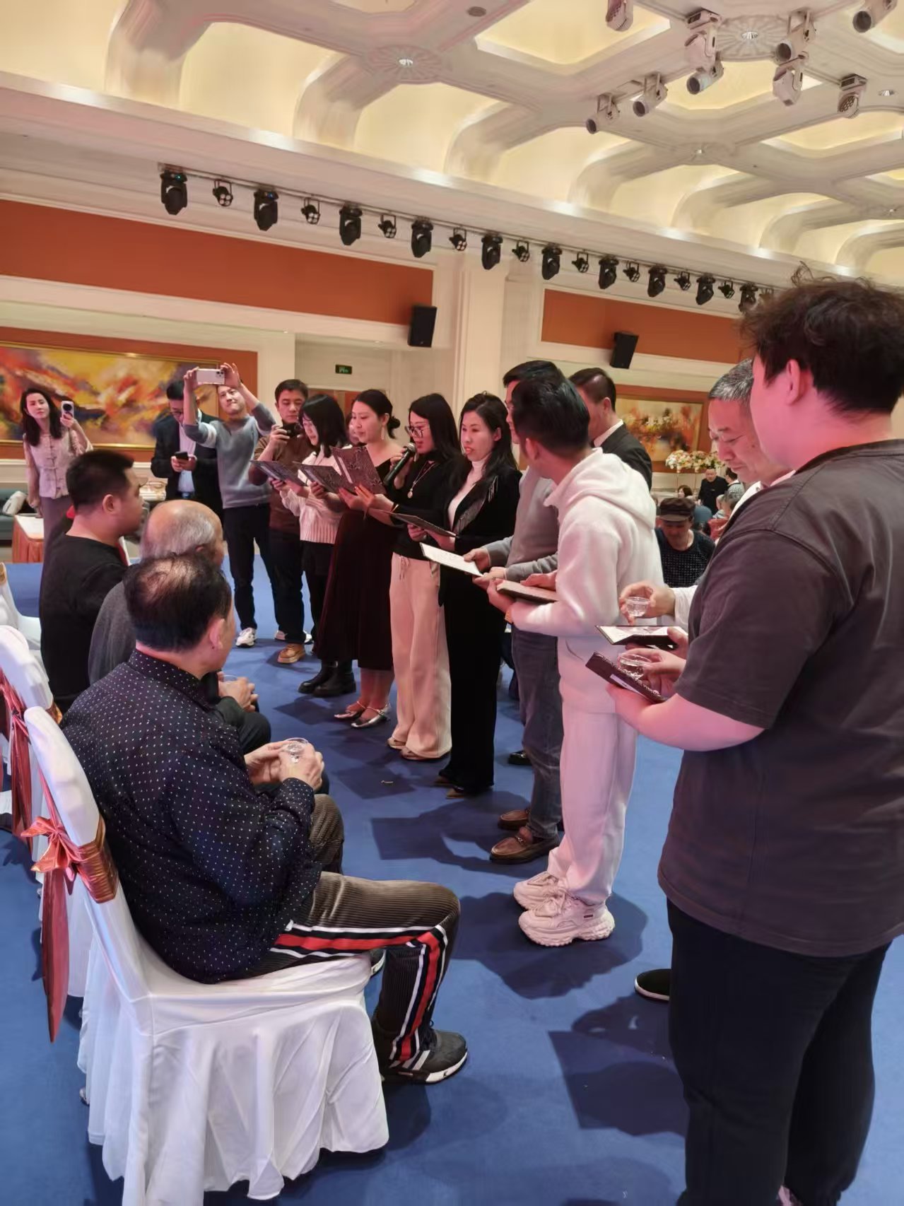仪式现场特设庄重的武学传承拜师环节,9位海灯武学第三代传人身着传统服饰,依次向第二代传承人肖飞翔先生行传统拜师礼。敬拜师茶、躬身行礼,一举一动尽显对传统礼仪的敬畏、对武学传承的赤诚,传人们齐声诵读传承誓词:“恪守师训,习武修德;传承禅武,慈悲济世;公益践行,不负韶华。”这场跨越代际的传承仪式,不仅是禅武技艺的接力,更是“习武修德、济世利民”精神内核的赓续,彰显出海灯禅武文化代代相传、生生不息的生命力,更为基金的公益传承之路注入了鲜活的新生力量。
